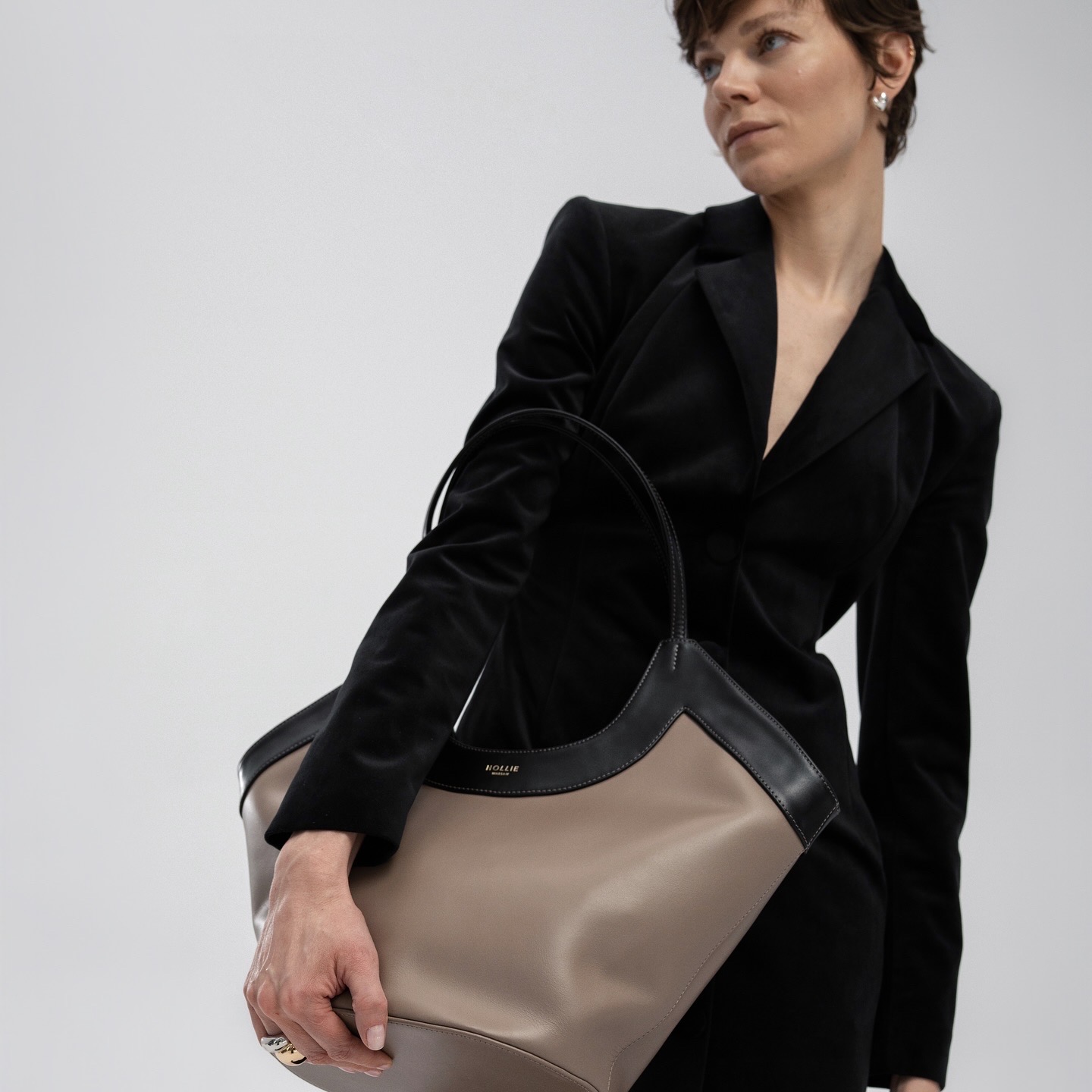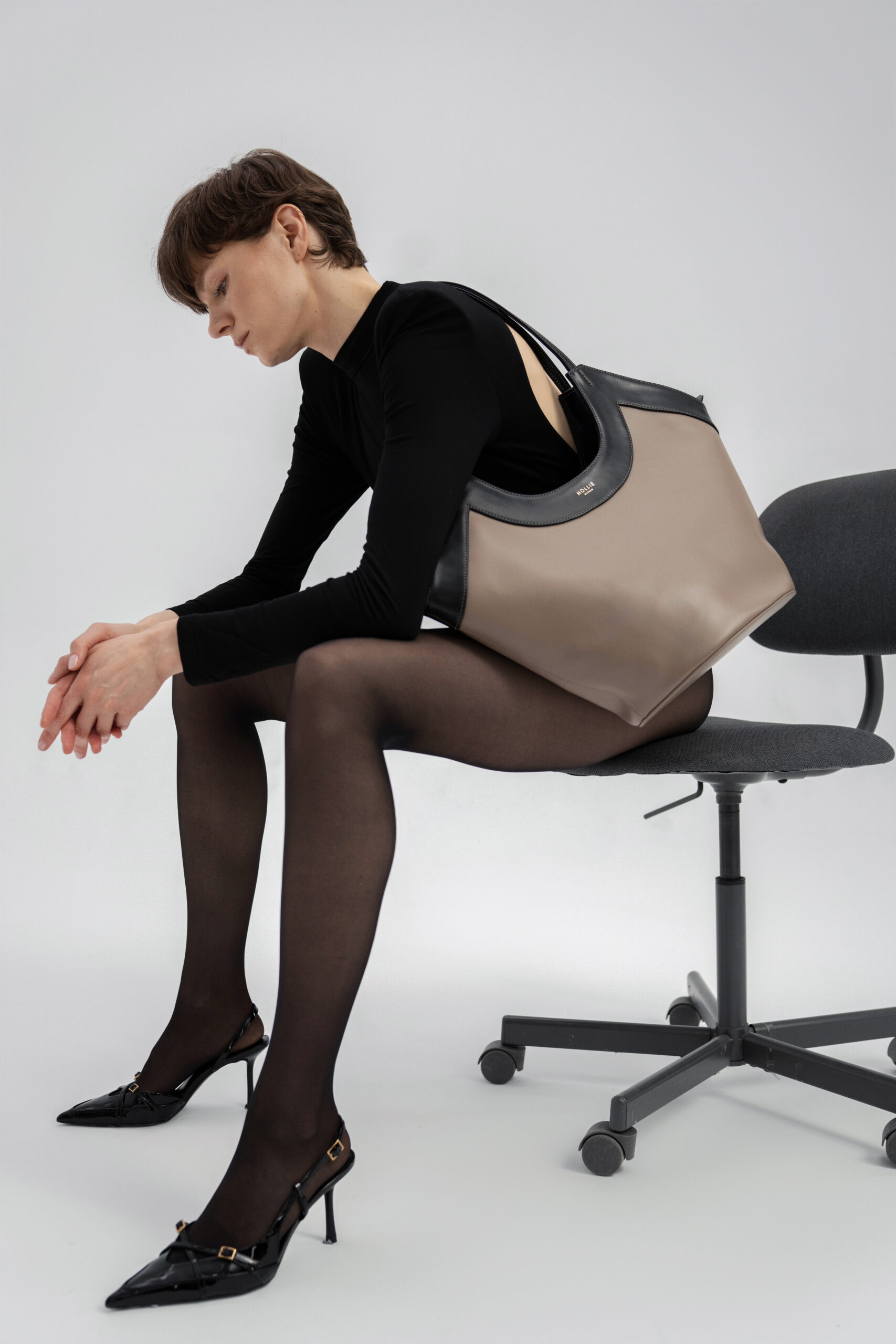 GLORIA is a large, spacious handbag made from Italian leather in two colors – black and taupe. It features a gold zip closure. For better organization, the interior includes three pockets, one of which is zippered. The bag has long, comfortable handles. The inside is finished with an elegant black lining, and the front is adorned with a gold embossed logo. It also comes with a charm featuring a gold logo bead. GLORIA is a unique handbag that fits everything you need!